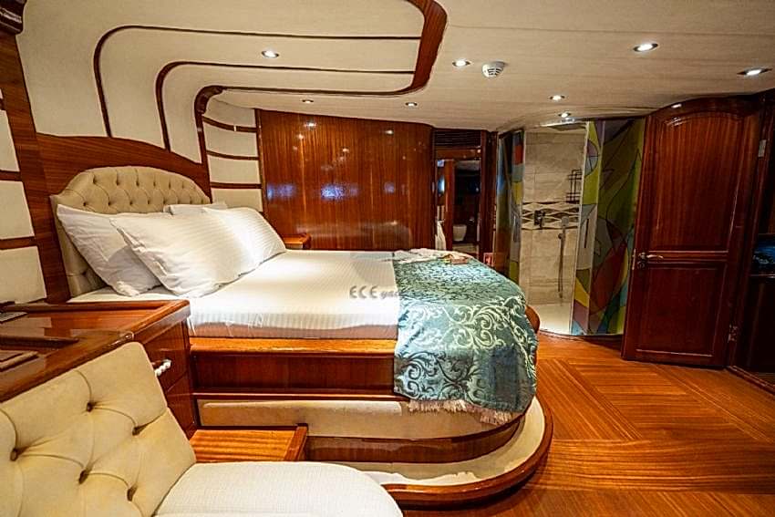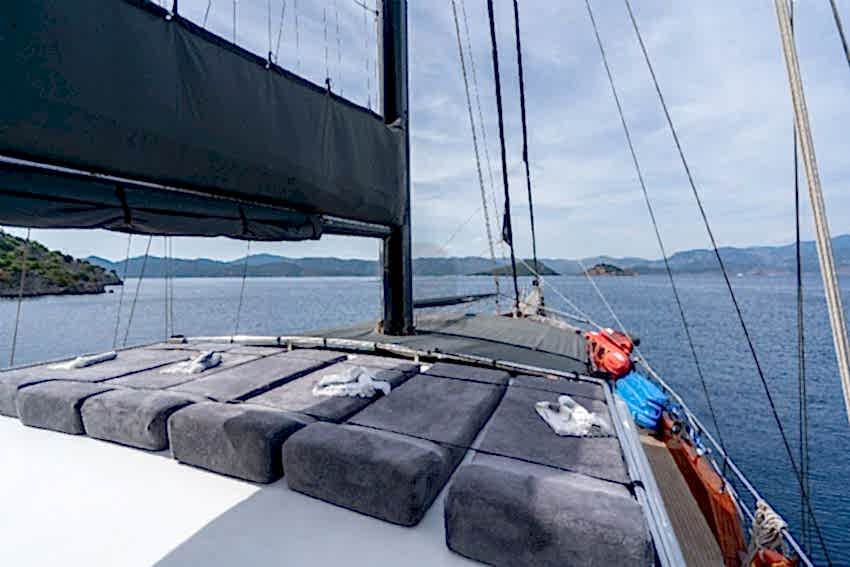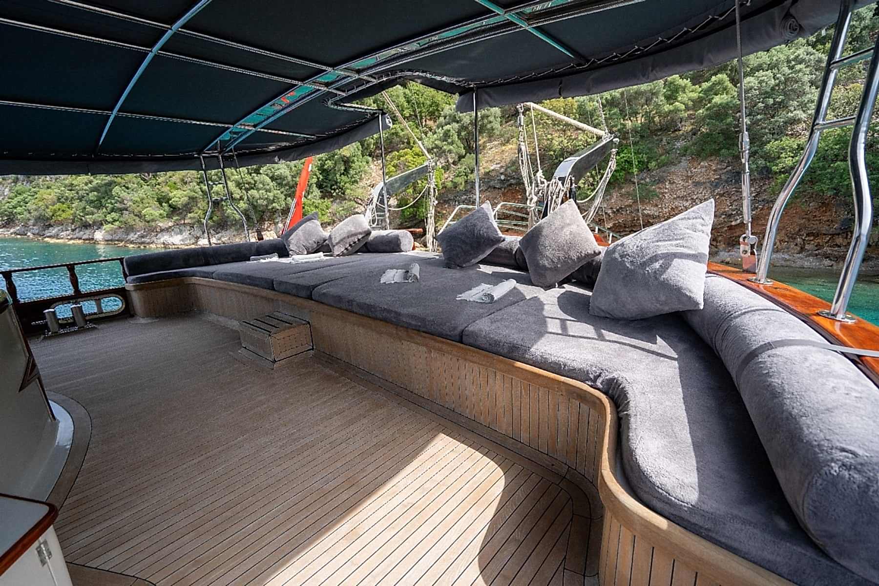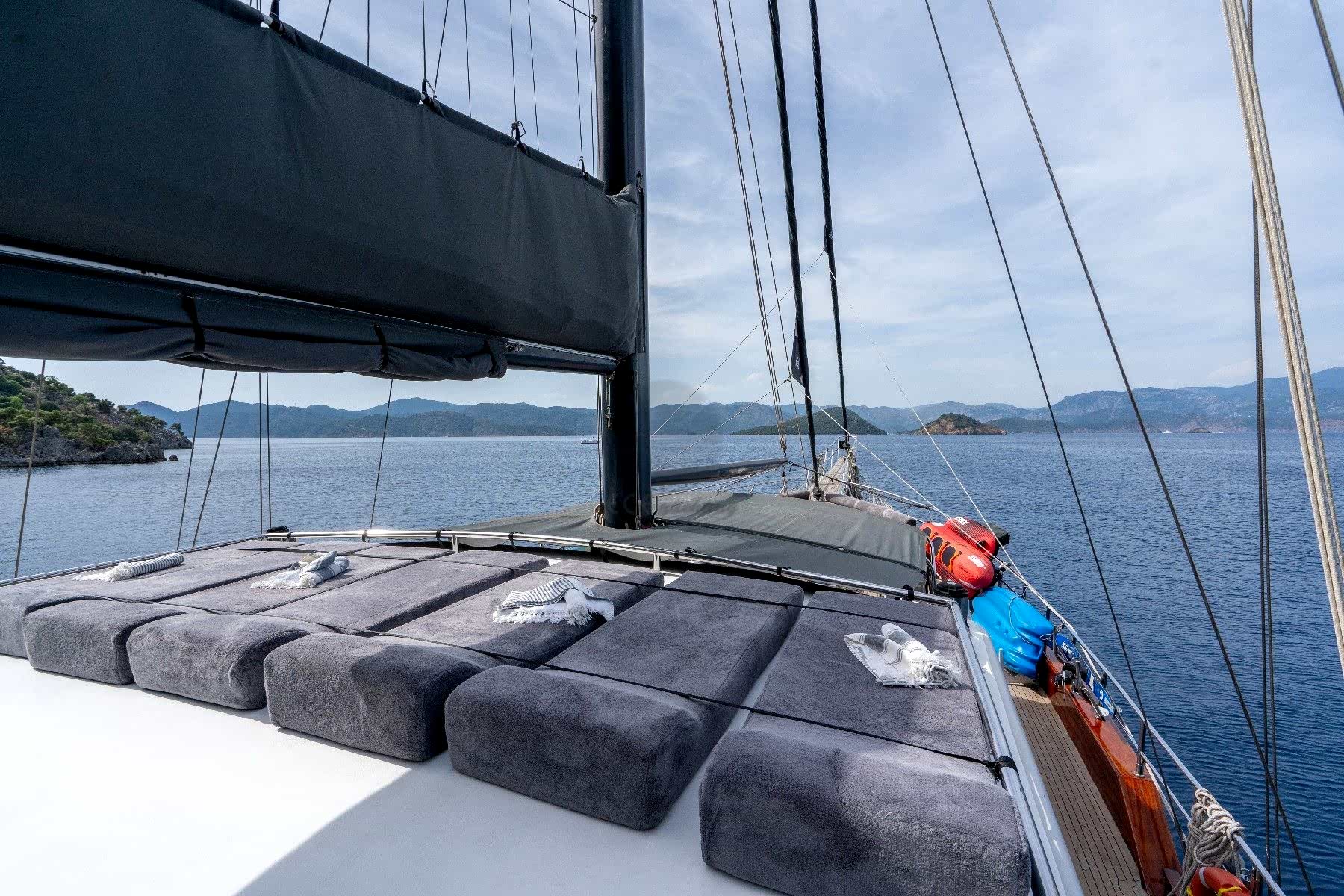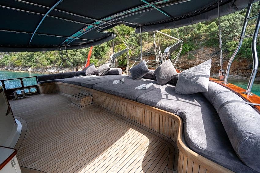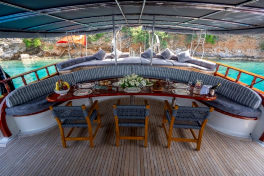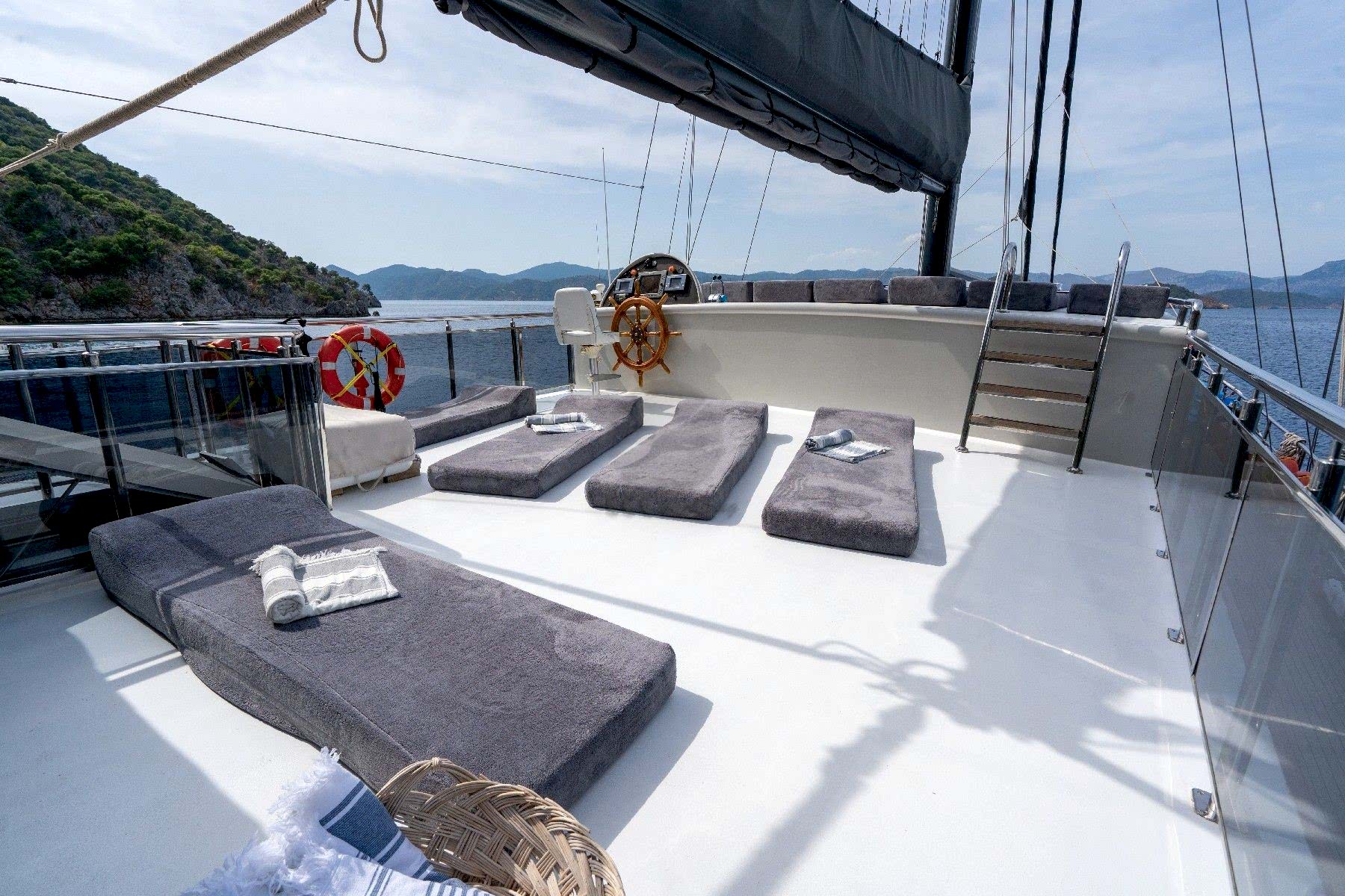 Mavi Yolculukta her türlü ihtiyaç göz önünde tutularak dizayn edilmiştir. Üstte güneşlenme alanı, ön ve arkada yemek masası ayrıca salonda da yemek masası bulunmaktadır. 33 metre boyundaki Gulet teknemiz delüks sınıfta hizmet vermektedir. Her türlü konfora sahip teknemizde konusunda uzman, 1 kaptan, 1 gemici, 1 aşçı, 1 oda görevlisi ve 1 adet hostes bulunmaktadır.
