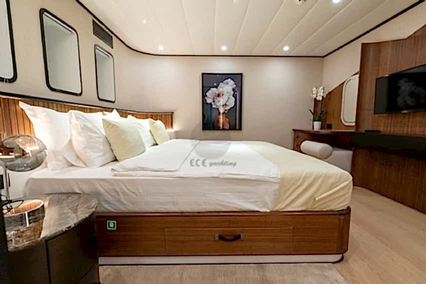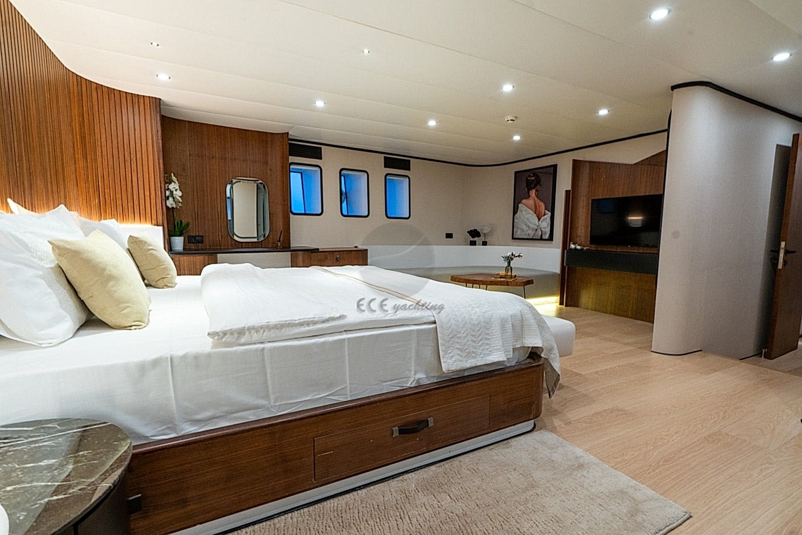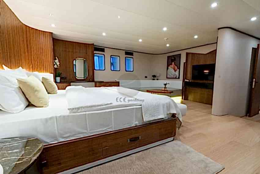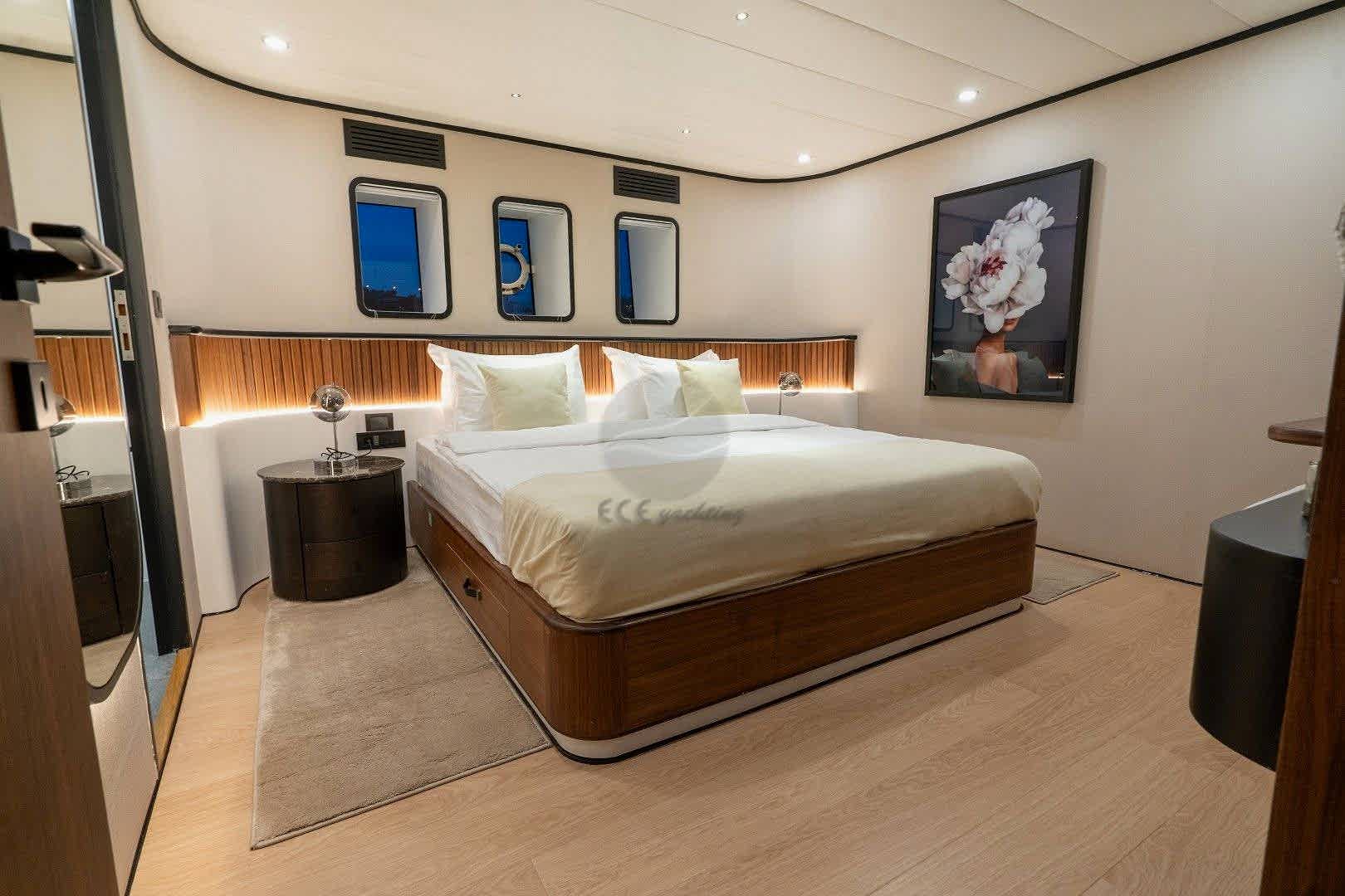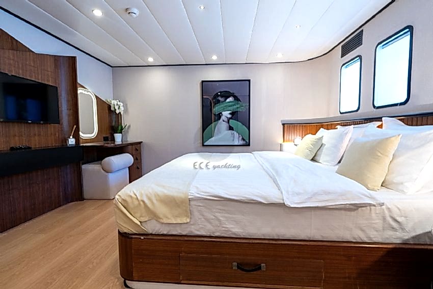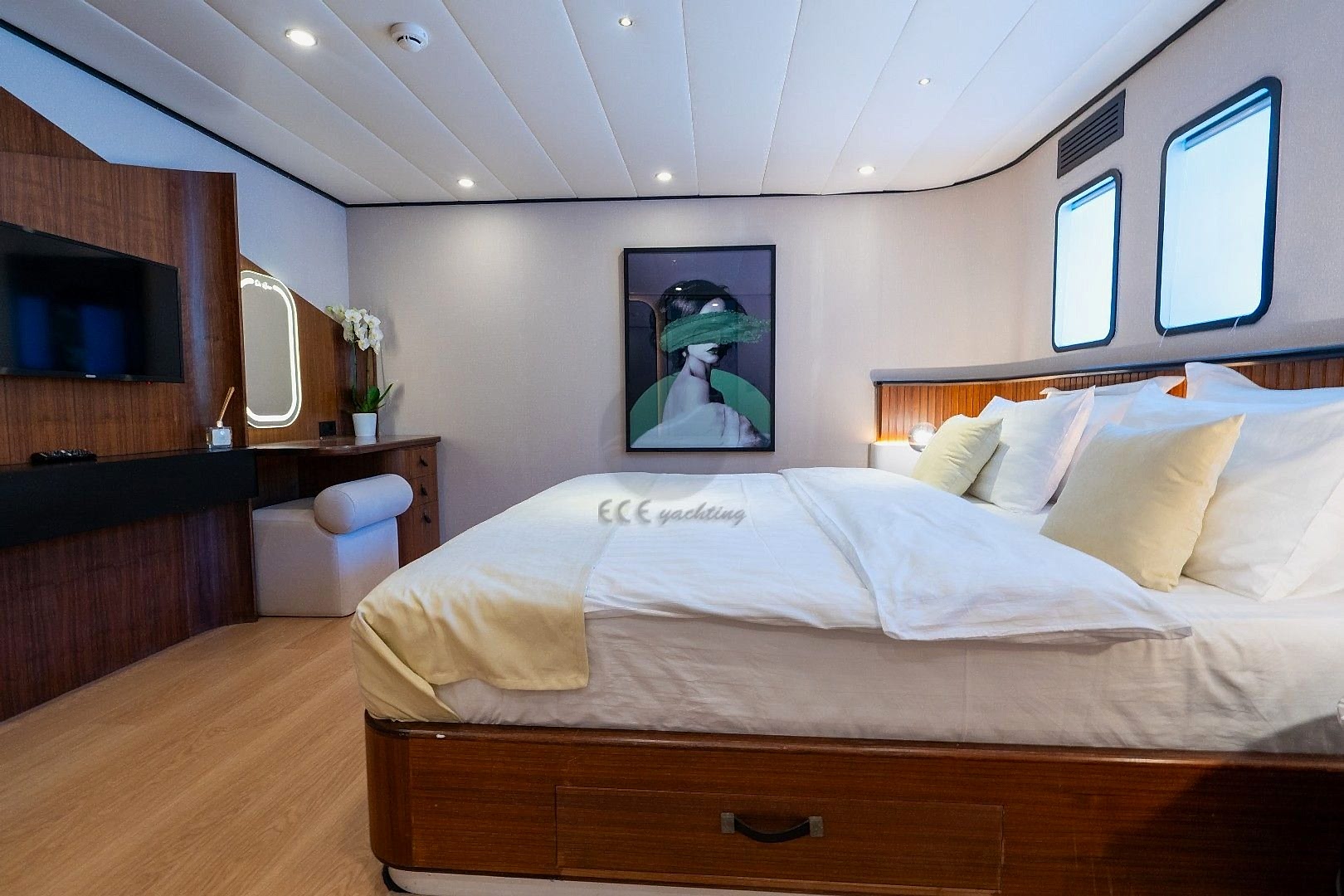 50 metre uzunluğunda, zarif tasarımı ve üstün özellikleriyle seçkin konuklarına unutulmaz bir deneyim sunar. 7 Geniş kabininde (1 Master, 6 Vip) toplam 14 misafiri ağırlayabilen bu gulet, modern tasarımı ve konforlu yaşam alanlarıyla fark yaratır. Klimalı kabinler ve zarif bir oturma alanı, rahatlıkla dolu bir tatil vadediyor.