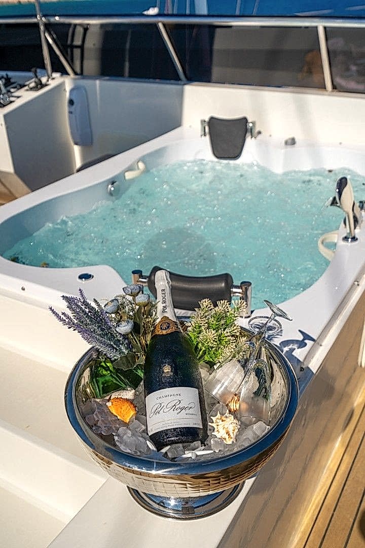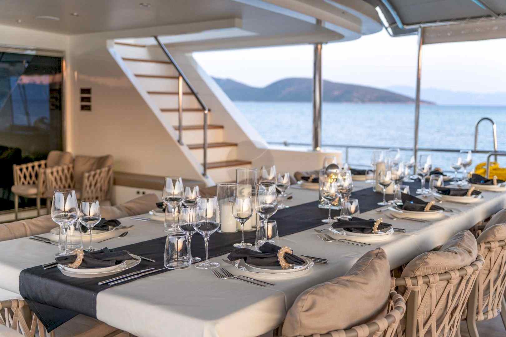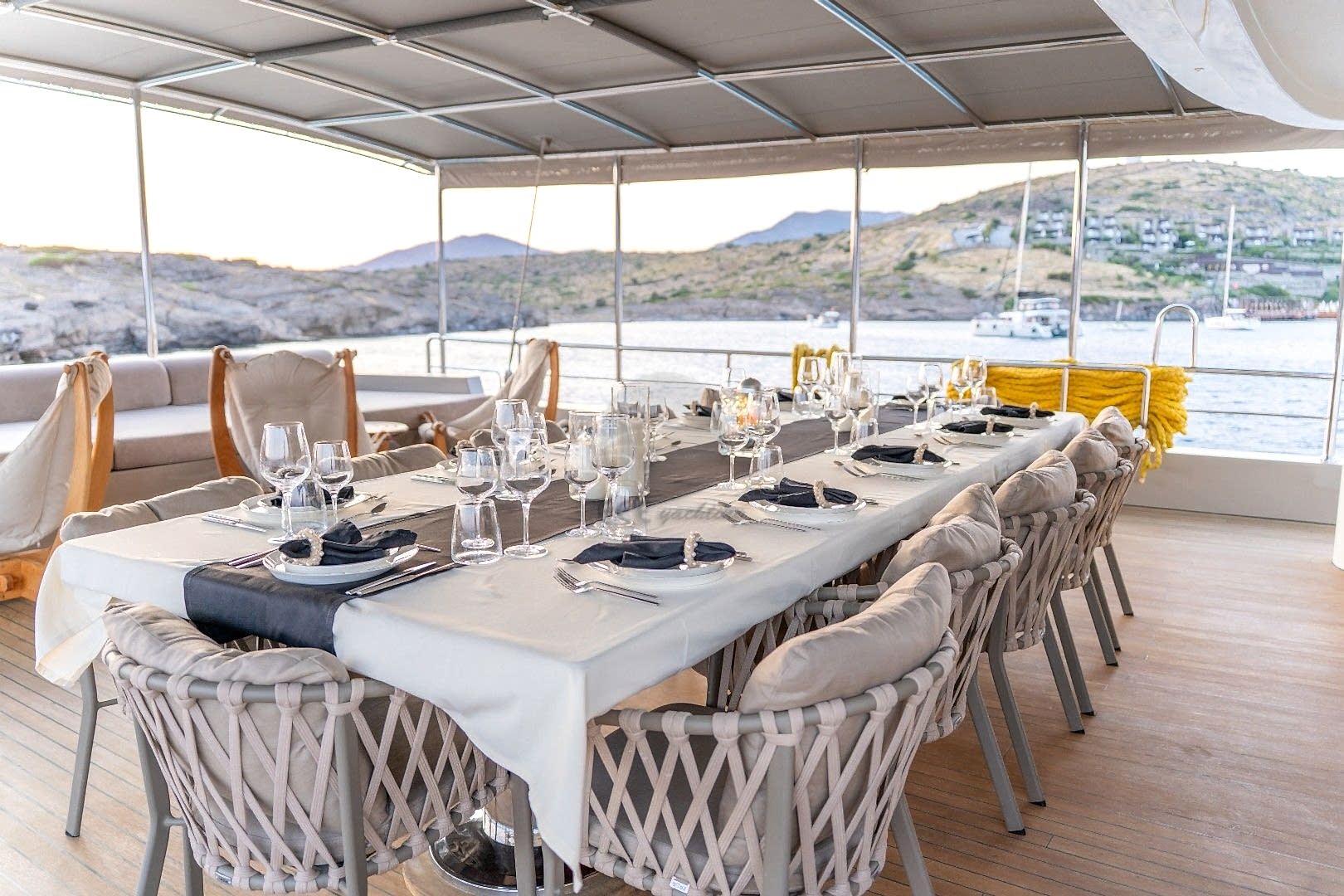 Yatın güvertesi, gün batımının tadını çıkarabileceğiniz geniş bir yemek alanı ve güneşlenme teraslarıyla tasarlanmıştır. Güçlü motor ve jeneratör kapasitesiyle bu lüks yat, güvenli ve enerji dolu bir seyir deneyimi sağlar. Eğlence arayanlar için paddleboard, su kayağı ve diğer su sporları ekipmanları da misafirlere sunulmaktadır.
