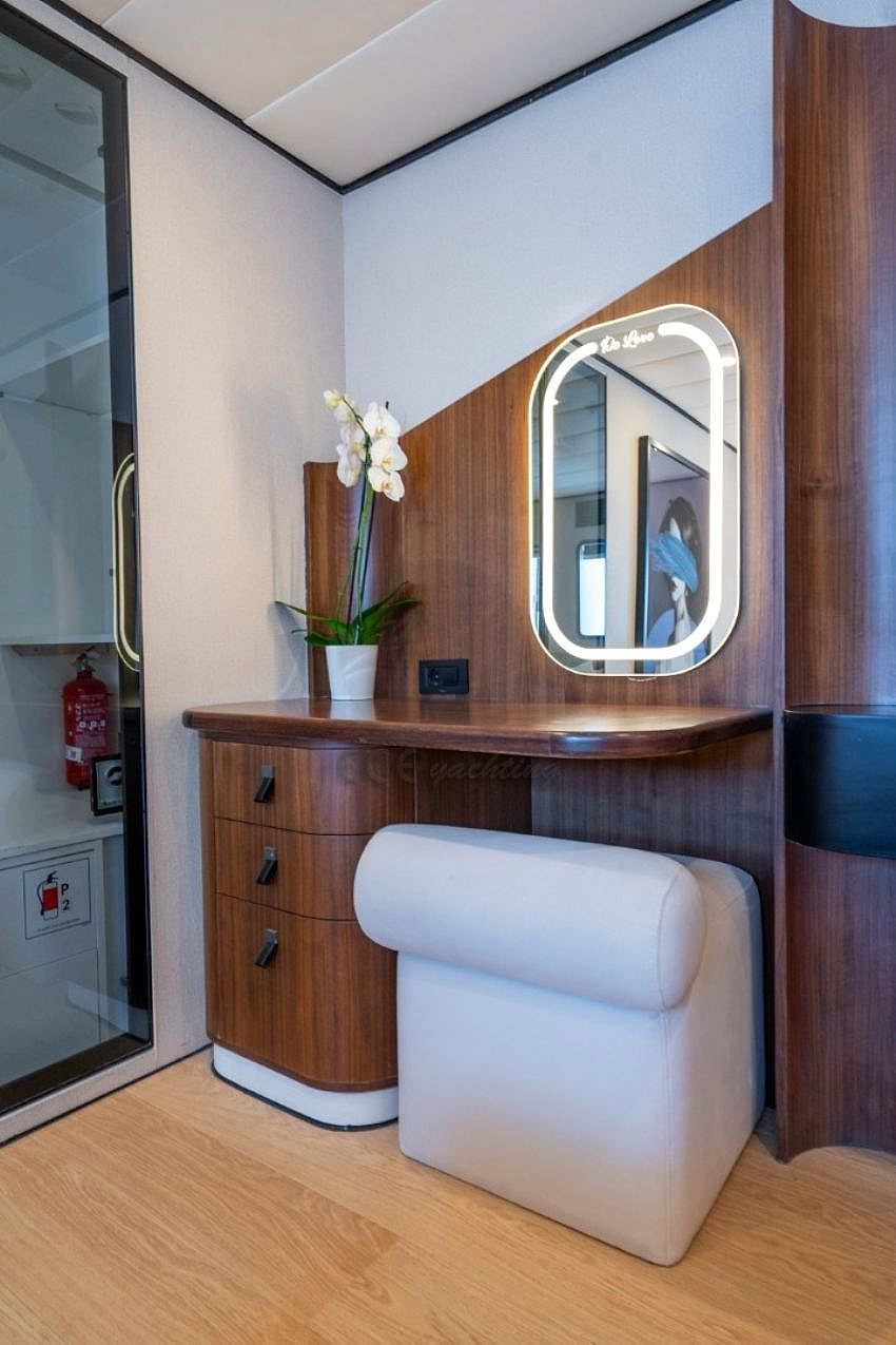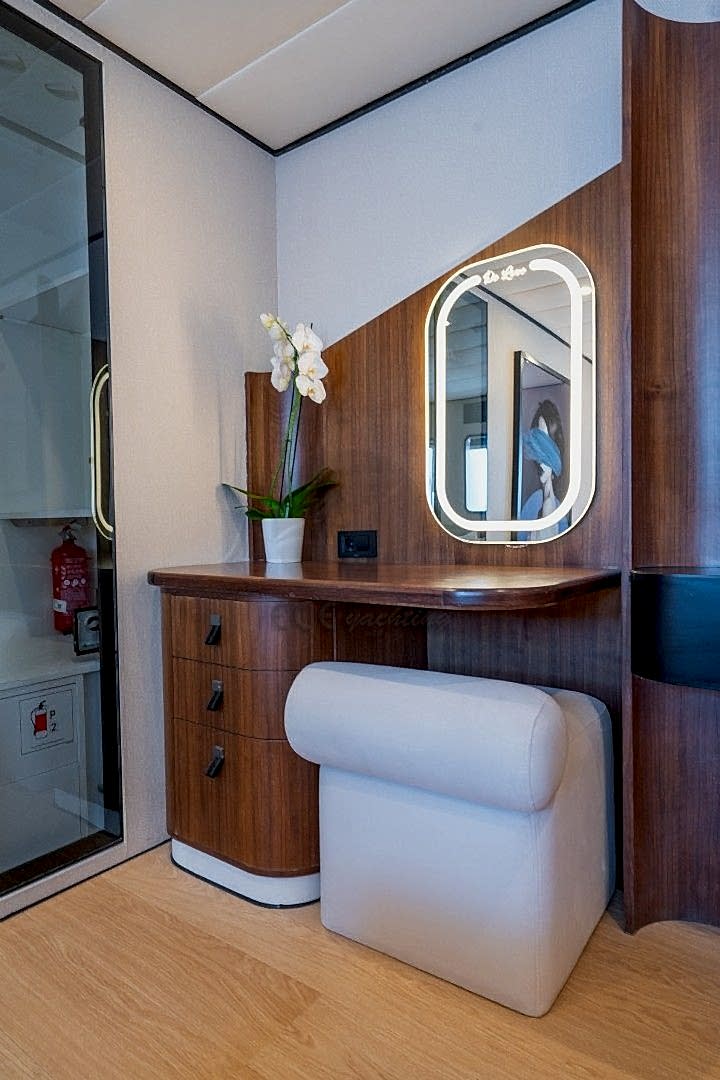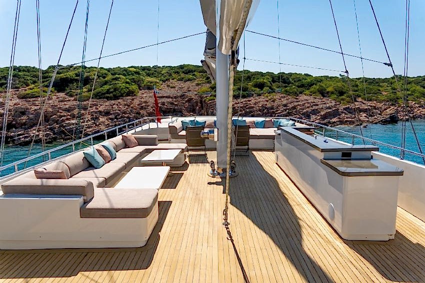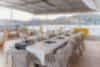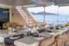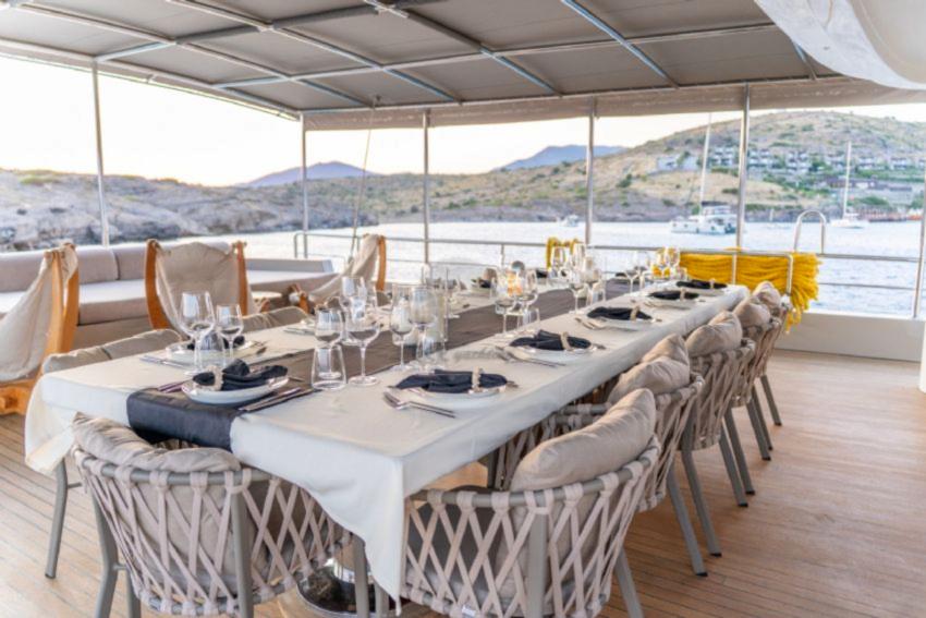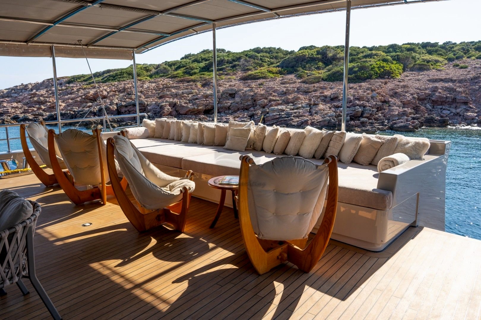 Yatın güvertesi, gün batımının tadını çıkarabileceğiniz geniş bir yemek alanı ve güneşlenme teraslarıyla tasarlanmıştır. Güçlü motor ve jeneratör kapasitesiyle bu lüks yat, güvenli ve enerji dolu bir seyir deneyimi sağlar. Eğlence arayanlar için paddleboard, su kayağı ve diğer su sporları ekipmanları da misafirlere sunulmaktadır.