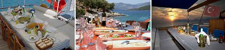 Kabin kiralama programlarımızda sabah kahvaltısı geleneksel Türk damak tadına uygun geniş bir menüden oluşur. Öğle yemeği genelde mevsim sebzelerinden taze olarak ve zeytinyağlılarla süslenir. Ardından beş çayında kek, pasta ya da bisküvi ikramı yapılır. Akşam yemeklerinde ise et, balık ve tavuk seçeneklerinden birer gün arayla uygun olarak mangal fırın ya da yemek şeklinde zeytinyağlı mezeler ve salatalarla süslenmiş bir menü vardır. Tüm servisler tekne personelimiz tarafından yapılır.